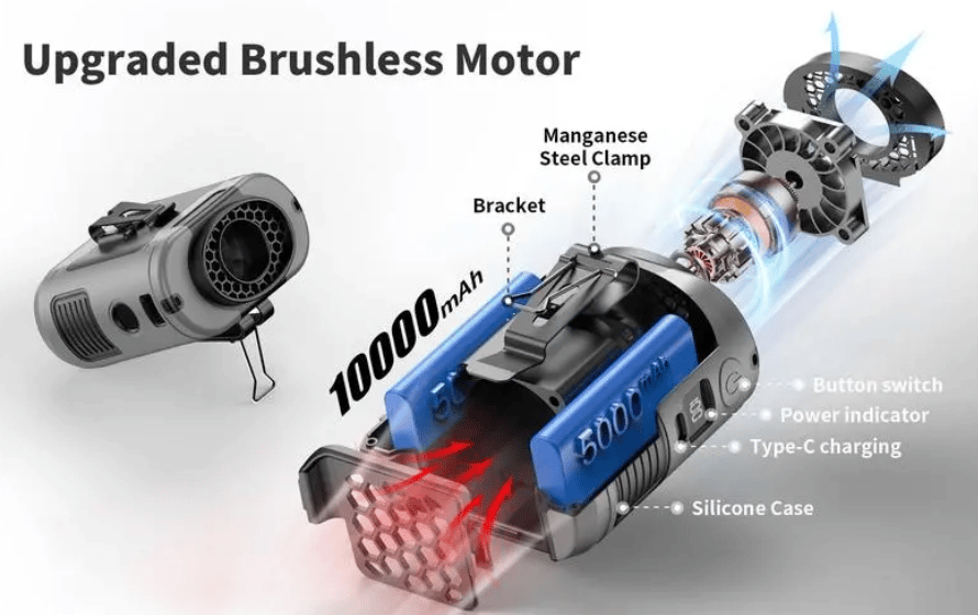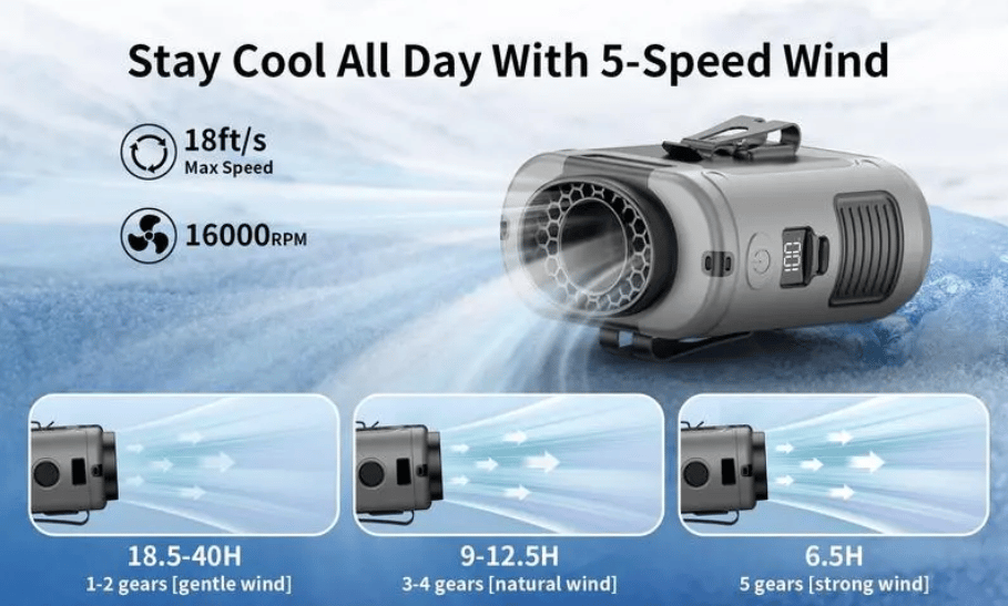 【Long Lasting Working Time】Built-in 5000mAh rechargeable battery, which can be run continuously for up to 40 hours at low speed according to the air speed and light mode, and takes 4-5 hours to to fully charge.