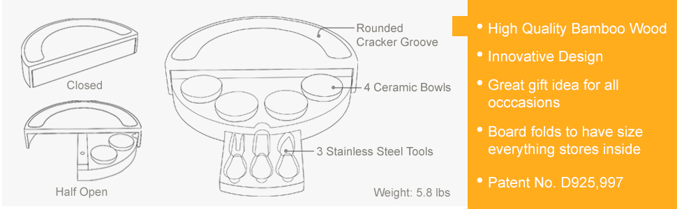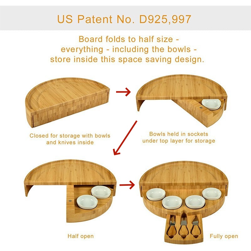 Maximum spread with minimal footprint: That's what every good entertainer craves. This collapsible cheese board delivers. With special sockets for ceramic serving bowls, a groove that keeps your favorite crackers contained, and a secret drawer stocked with three cheese knives, this bamboo hosting hack helps make crudités and savory goodies look irresistible. The best part? It folds down to half its size, so it's easy to stow in your cupboard, too. (If you're wondering about the bowls, they fit inside.) Fruits, olives, chocolate-covered almonds… this thing accommodates them all. Now we're hungry. Designed in California. Made in USA. Made from ceramic, stainless steel, bamboo Measurements 15" W x 8.5" D x 3" H (closed), 15" Diameter x 3" H (open) Care Handwash and dry bamboo board & cheese tools, do not soak. Ceramic bowls are dishwasher safe.