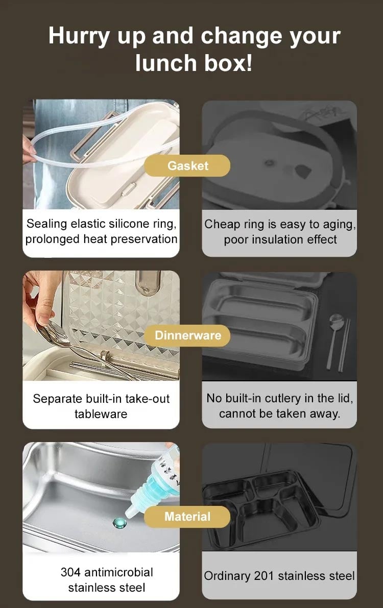 Separate compartment design, nutrition collocation, not easy to smell. It also comes with a separate soup bowl, sealed and leak-proof for easy access.