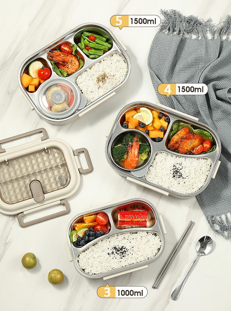 Available in 3, 4, and 5 compartments with a large capacity of 1000ml/1500ml, enough food for one person.